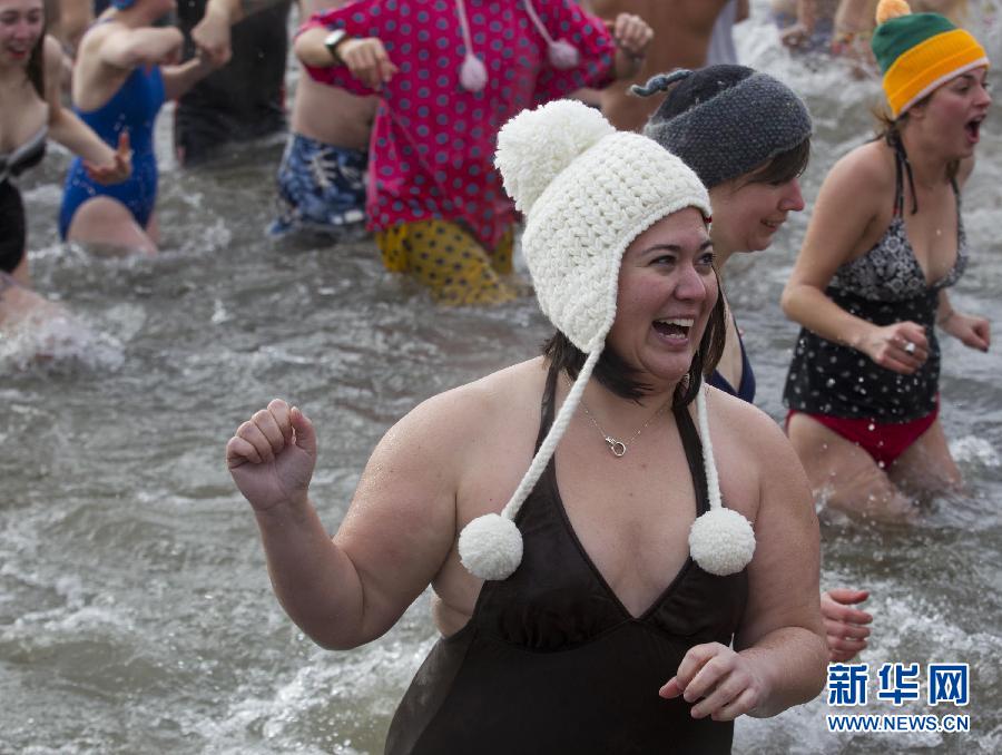 1月1日,人们冲入冰冷的安大略湖中。当日,加拿大多伦多举办2014年北极熊冬泳活动,数百名参与者在零下13摄氏度的天气里,以冬泳、戏水等方式迎接新年。新华社发(邹峥摄)