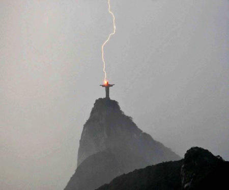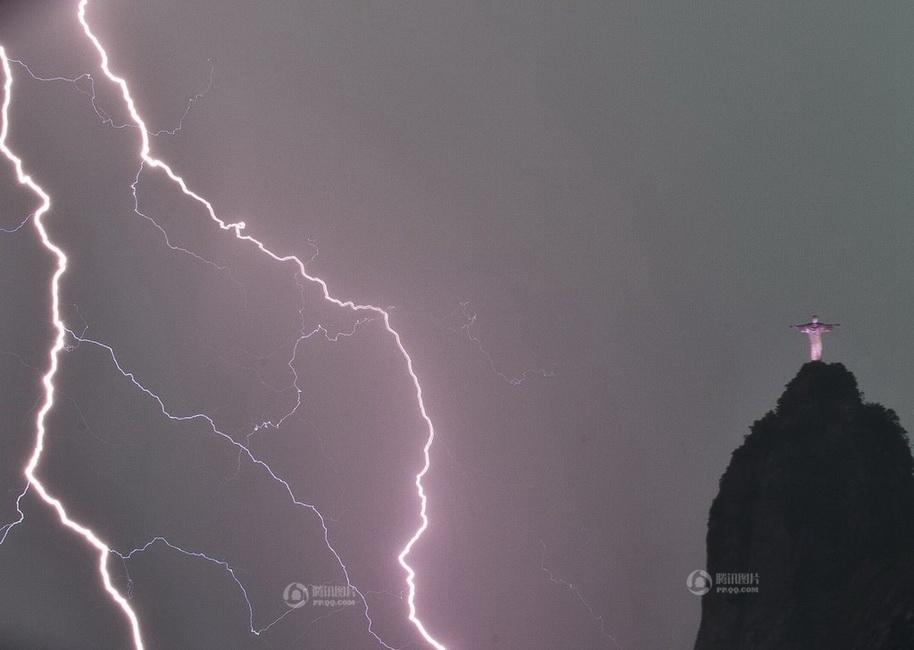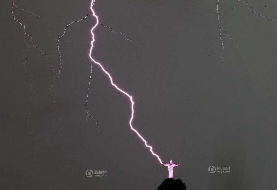 资料图:2008年2月11日,巴西里约热内卢,一束闪电击中著名地标耶稣基督像。