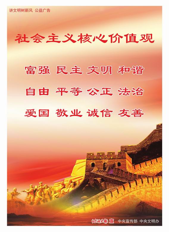 现在打开电视、广播、报纸和各主流网站,映入眼帘和入耳所闻最多的是社会主义核心价值观。哪么,什么是社会主义核心价值观呢?党的十八大在建设中国特色社会主义文化强国目标下,明确提出“倡导富强、民主、文明、和谐;倡导自由、平等、公正、法治;倡导爱国、敬业、诚信、友善,积极培育和践行社会主义核心价值观。”