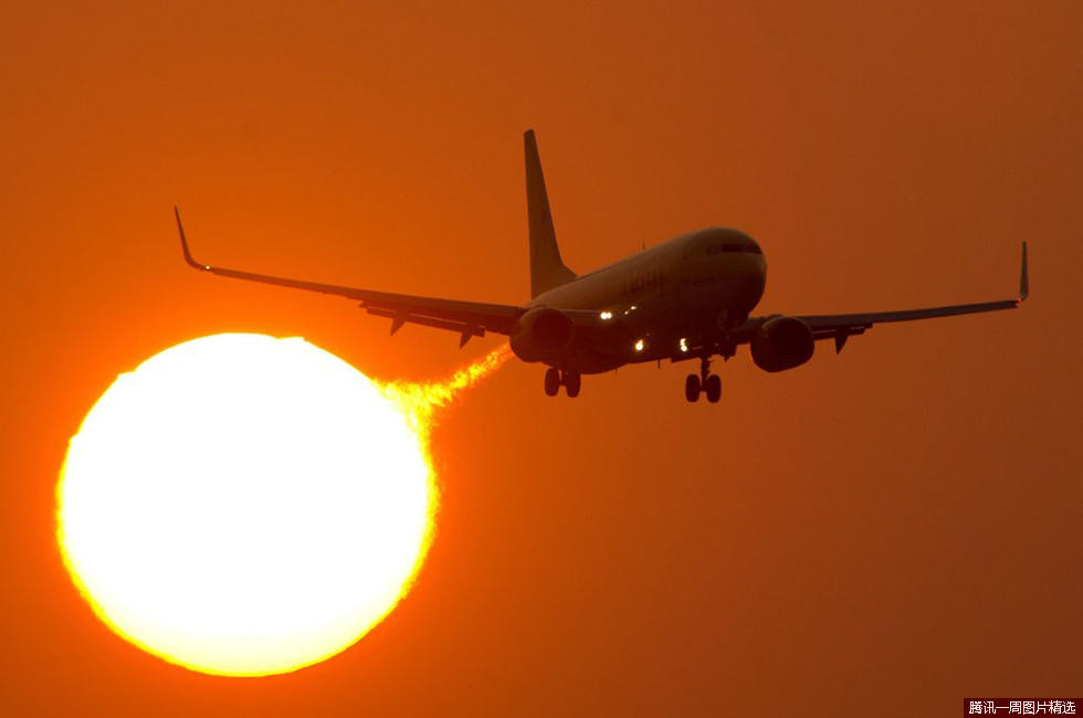 当地时间2014年3月14日,德国斯图加特,夕阳的余晖照在波音737客机排出的尾气上,好像飞机喷出一个巨大的火球。