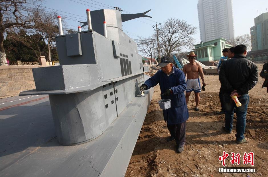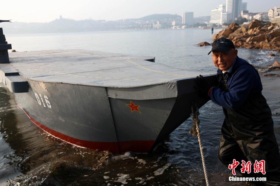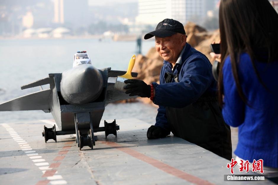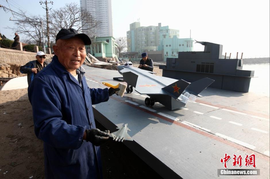 4月1日下午,山东省青岛市汇泉路海边,家住武昌路的温玉柱老人在为自造的“航母”进行最后的修饰,并把“舰载机”搬上了甲板进行“试机”。
