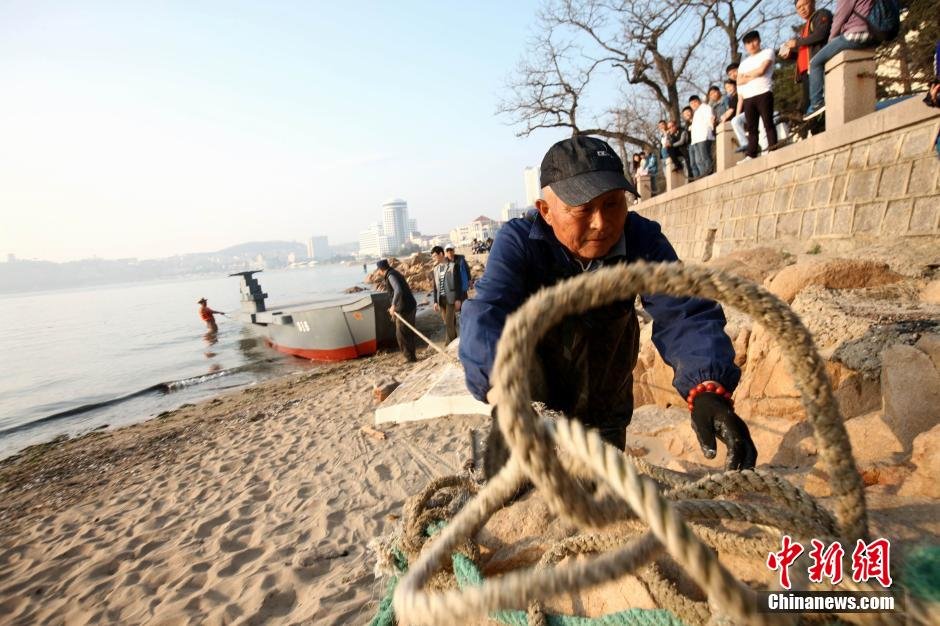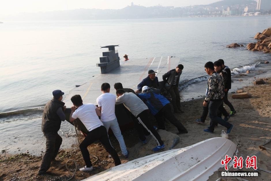 “试机”完毕后,在路人的帮助下,这艘“航母”成功下水。