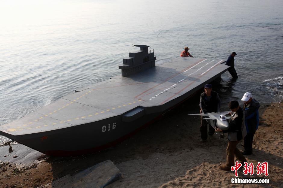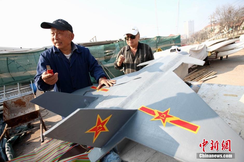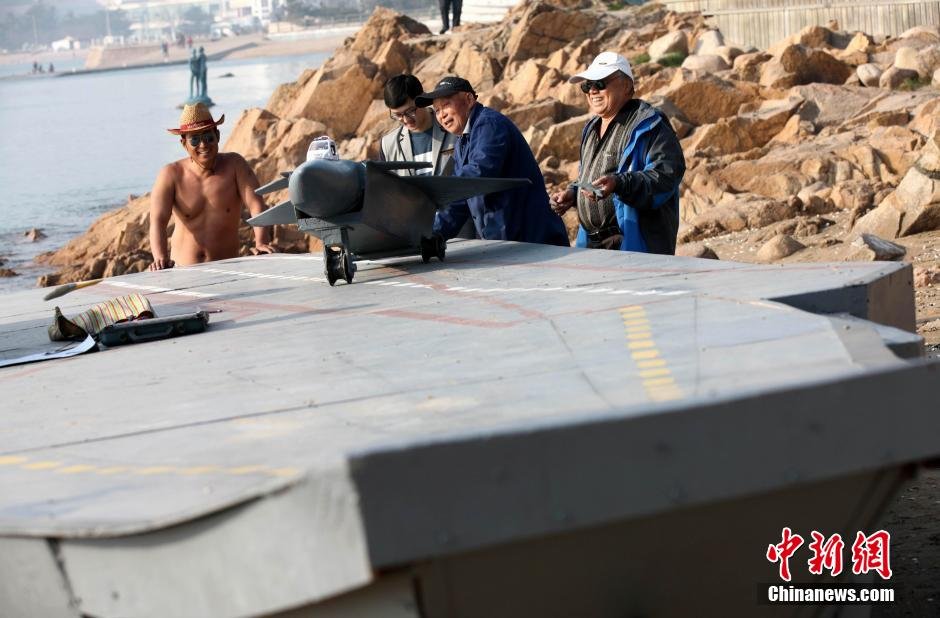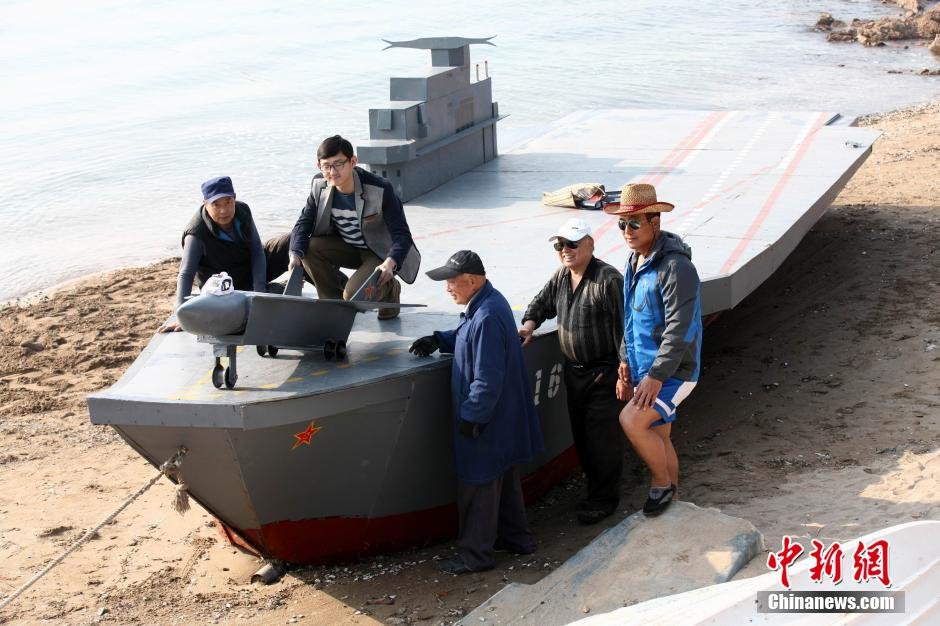 温玉柱老人把“舰载机”搬上了甲板进行“试机”。