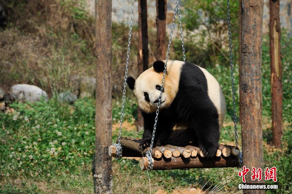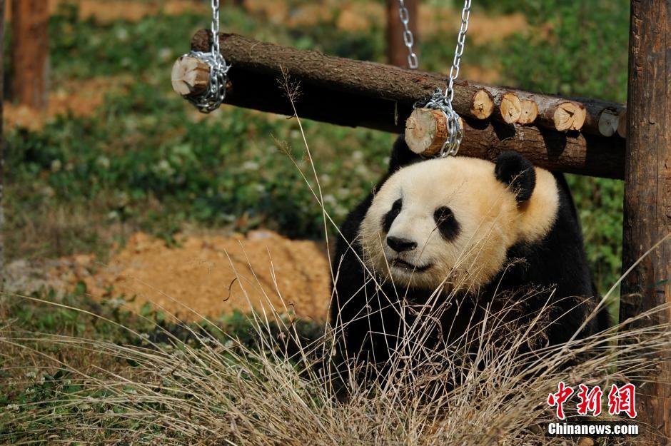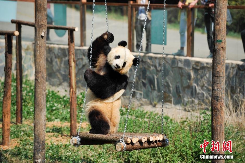 4月14日,在新玩具上玩耍的大熊猫思嘉。