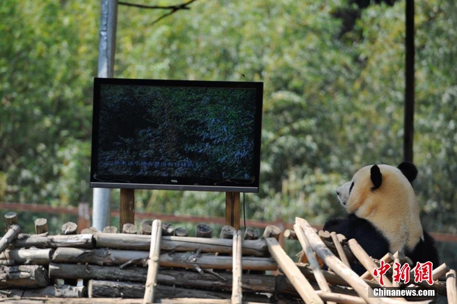 4月14日,正在看电视的大熊猫思嘉。近日,在云南野生动物园寄养的大熊猫美茜回四川后,单独留在昆明的大熊猫思嘉情绪低落,开始出现了许多反常举动。