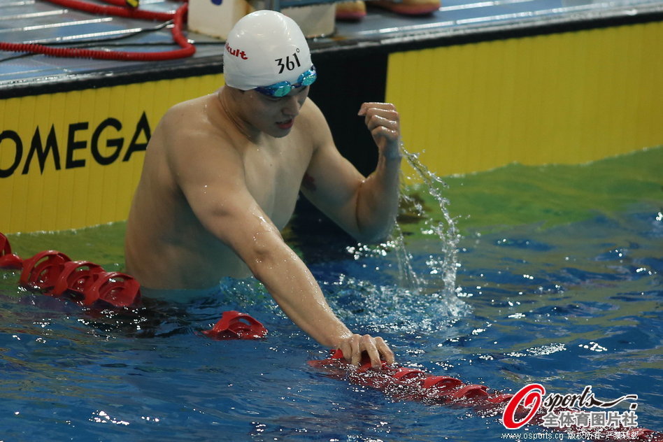 在决赛中,孙杨的速度明显比预赛时快。特别是在最后100米游程中,孙杨的速度明显比此前有所加快。最终,孙杨凭借3分45秒12的成绩获得冠军。这是孙杨在本次比赛中获得的第二个冠军。不过这个成绩只能排在今年此项目世界第五位。朴泰桓在今年曾游出过3分43秒96的成绩。朴泰桓比孙杨快了1秒16。
