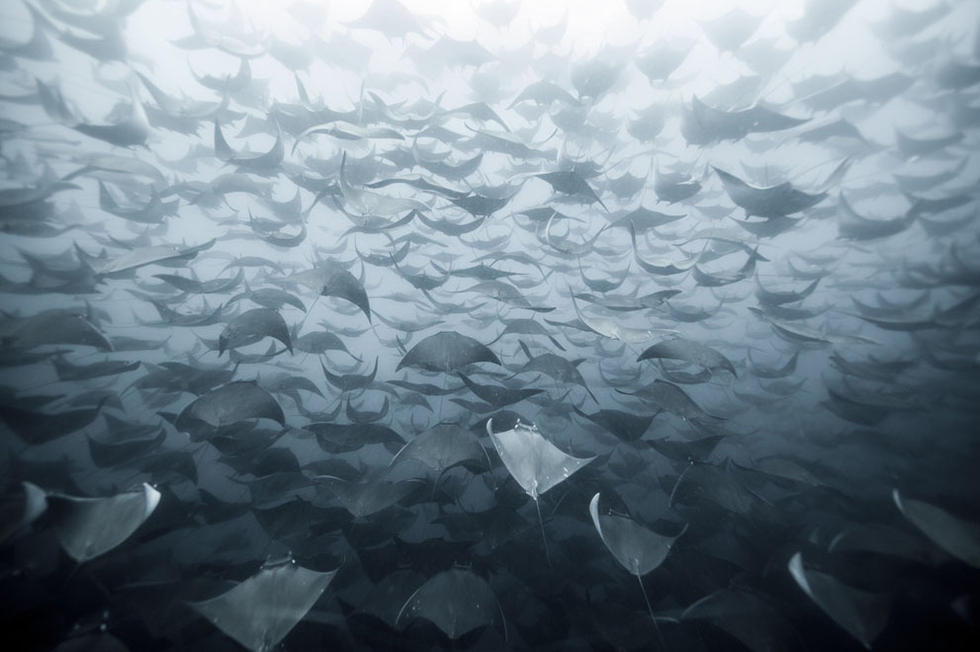 在前往墨西哥巴哈将鲨鱼从渔夫的鱼钩上接下时,摄影师非常幸运的拍摄到了大群的蝠鲼。它们游动的非常迅速,我们无法从水面追踪它们。