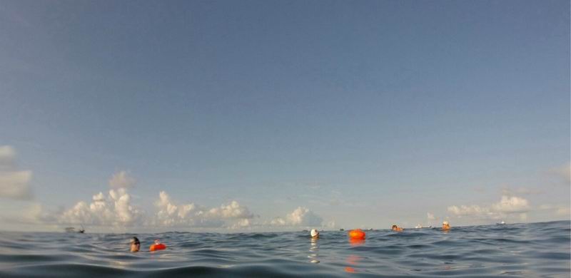 七夕的早上,很多的人间仙女和她们的老公已泡在海水里,他们默默注视着对方在轻言细语。轻柔的南风把两人窃窃私语随风潜入我的耳朵,“老公,我爱你”,“老婆,我也爱你”