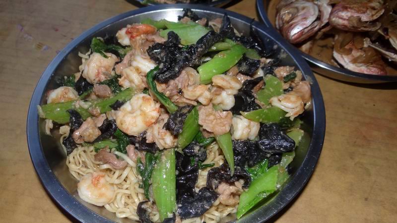 今早买的七夕虾,把大小分类急冻,剩下的能壳虾就剥去能壳,剥成虾仁与瘦肉、青菜、云耳一起炒一蝶面饮夜茶。