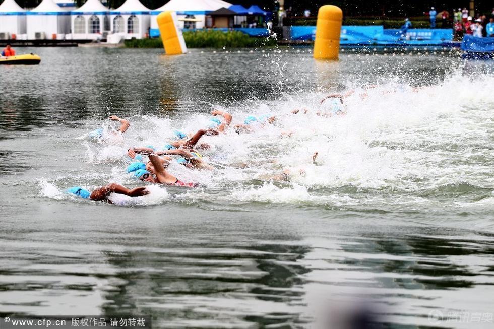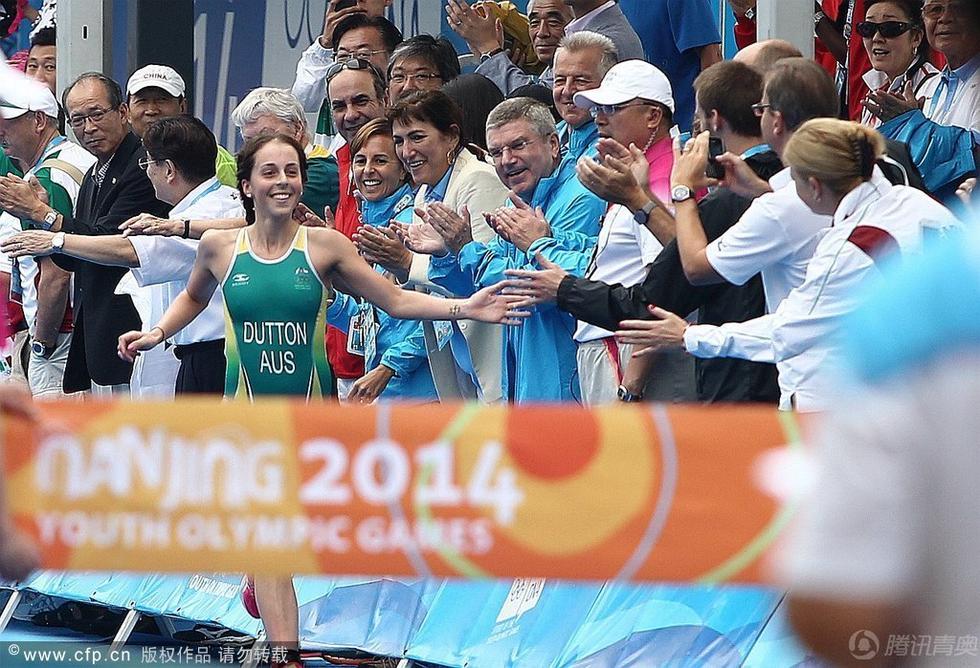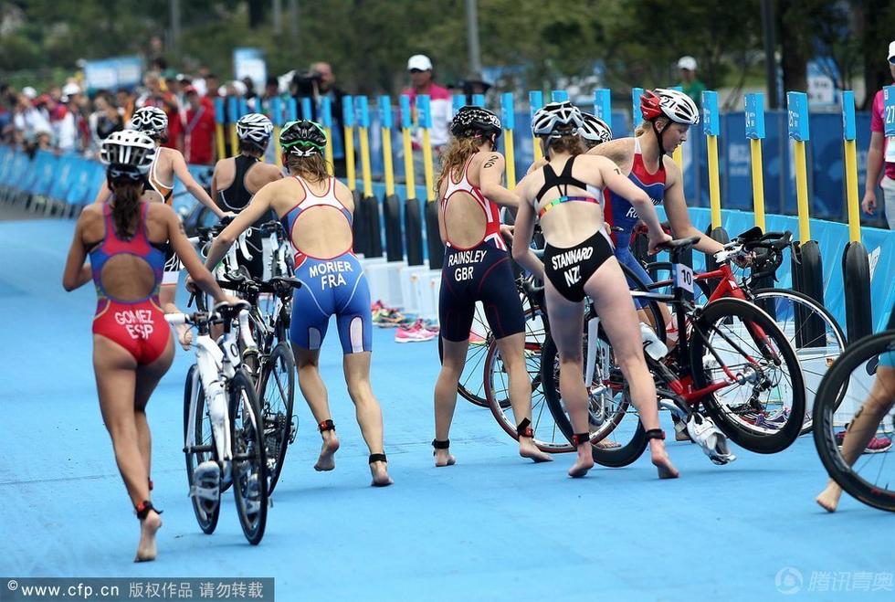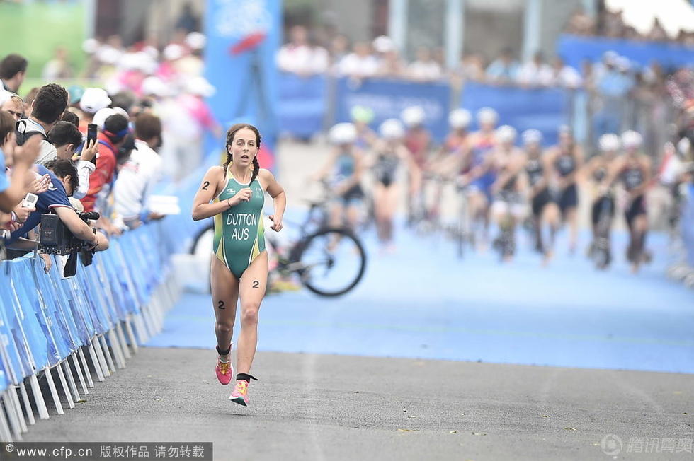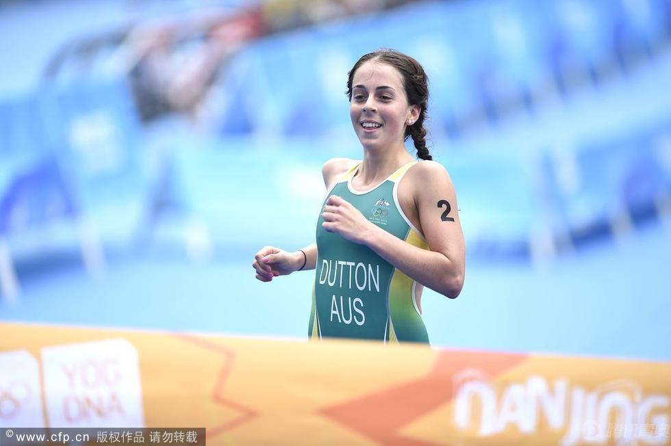 8月17日上午,南京青奥会女子铁人三项决赛在玄武湖举行,分别进行了游泳、公路自行车和公路长跑三项比赛。本届青奥会的首金由来自澳大利亚的2号选手DUTTON夺得,美国选手 JENKS和法国MORIER分别获得第二名,第三名。