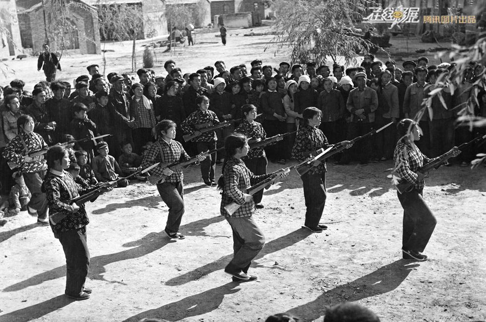 1965年,大寨女民兵为来自全国各地的参观者表演“不爱红妆爱武装”舞蹈。