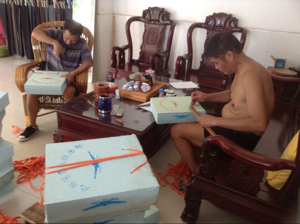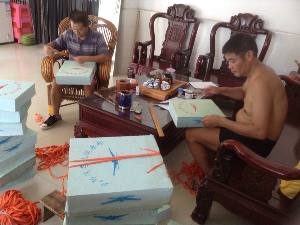 网购的北海北部湾冬泳俱乐部护泳浮板缚绳于昨天速递到北海。今天,摇水井海泳队的林师傅、梁师傅、阿凡提和酒鬼老坛等在早泳后就开始在护泳浮板上缚绳,经过一个上午的辛苦工作,首批20块护泳浮板的缚绳已绑好,待绑好最后一批浮板绳子后将发给队员。