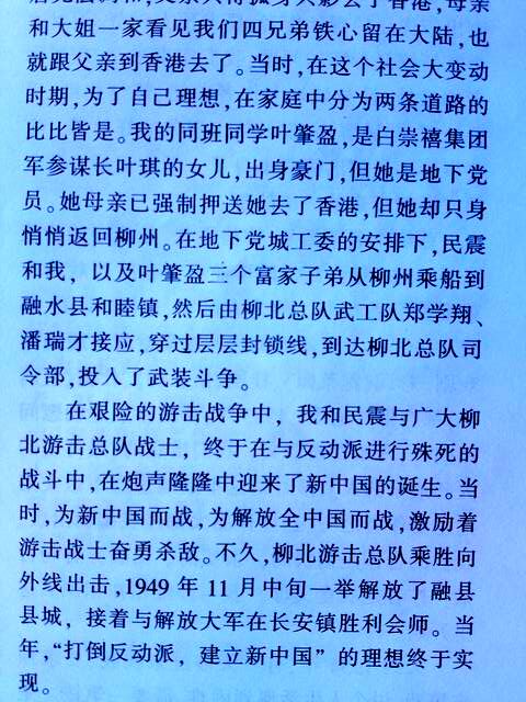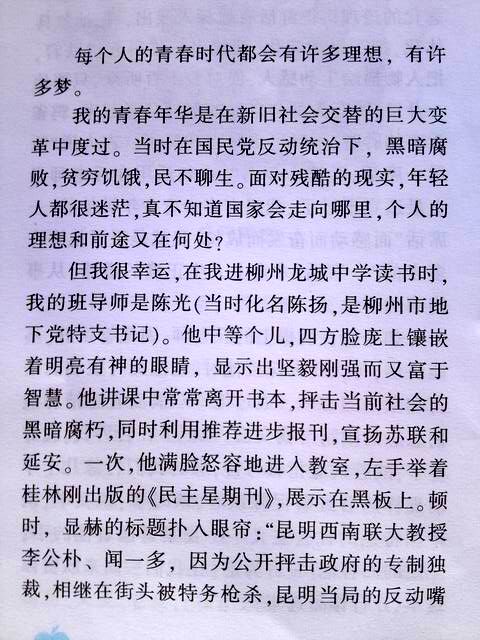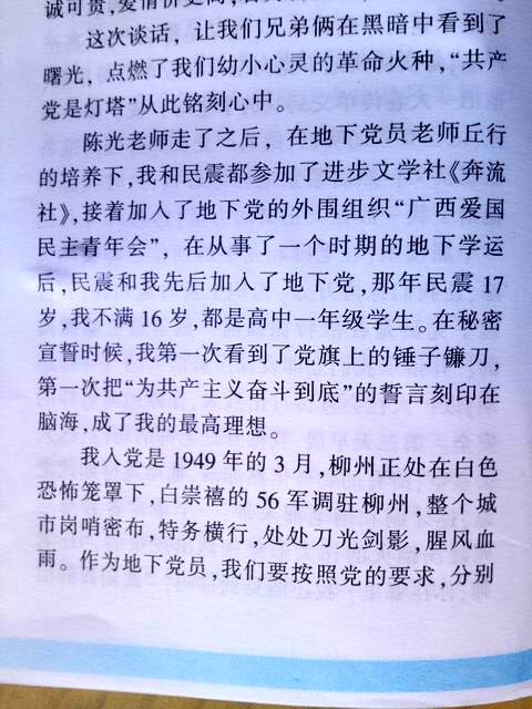 陈光老师调离柳州,地下党员老师方宏誉、丘行先后担任我和民震的班导师。在他们的教育培养下,我与民震的思想进一步觉醒,我15岁参加地下党,16岁转移柳北游击总队,从事武装斗争。我从一个年幼无知的少年,终于走上了革命道路,我们不会忘记启蒙导师陈光同志!