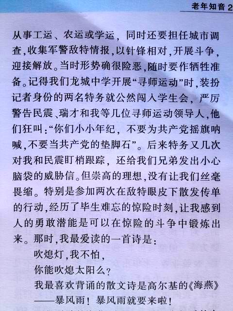 在他调离龙城中学时,他找我和民震作了一次长谈。当时他住在学校的“八角楼”。这座古老的木板楼房,居住的大都是进步教师,被称为龙城中学的“红楼”。我们进房后,他小心地关好门窗,压低声音,与我们谈了当时国内存在的严重局势。他说,国民党已全面向解放区进攻,气焰非常嚣张。但这是暂时现象,共产党最终会取得胜利,未来的中国只能靠中国共产党,希望我们坚定信念,走革命的道路。最后他给我们送了一张精美的书签,上面有他书写的著名诗句。其中一张写了匈牙利诗人裴多菲的名诗:
