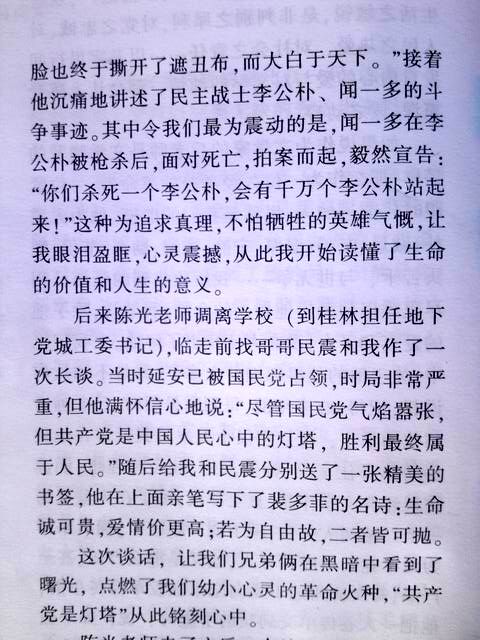当年7月中旬的一天,陈光老师满面怒容地走进我们的教室,他左手拿着桂林刚出版的进步刊物《民主星期刊》,高高举在头上怒吼道:“同学们,昆明西南联大教授李公朴、闻一多,因为敢于说真话,竟被特务杀害了。昆明当局的反动嘴脸也终于撕开了遮丑布而大白天下。”接着他讲述了期刊上报道李公朴、闻一多相继被害的经过。其中让我们特别感动的是,闻一多在李公朴被枪杀后,面对死亡威胁,拍案而起,毅然宣告:“你们杀死一个李公朴,会有千万个李公朴站起来!”“我们不怕死,我们随时像李公朴先生一样,前脚跨出大门,后脚就不准备再跨进大门!”这些正气凛然视死如归的话语,让我们热血沸腾,热泪盈眶,至今仍深深印在脑海中。