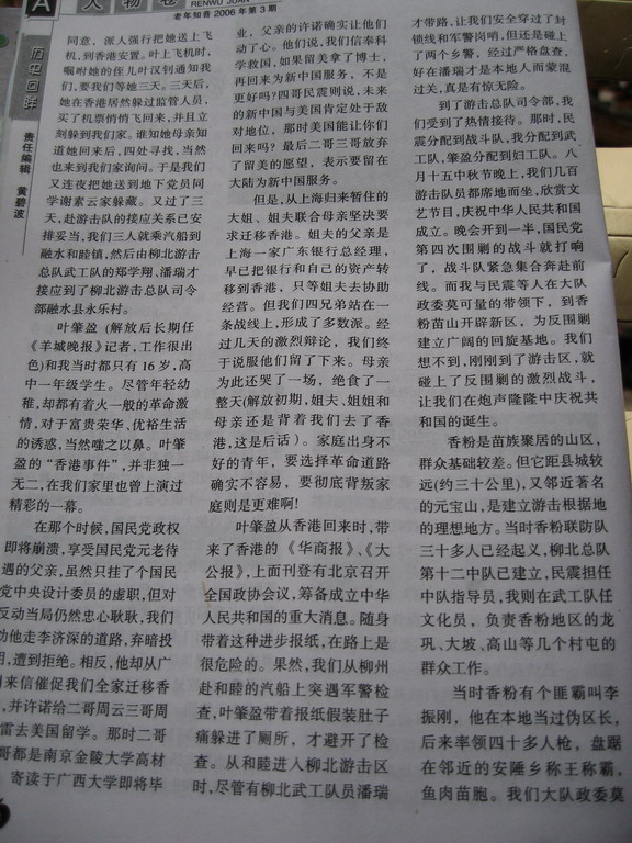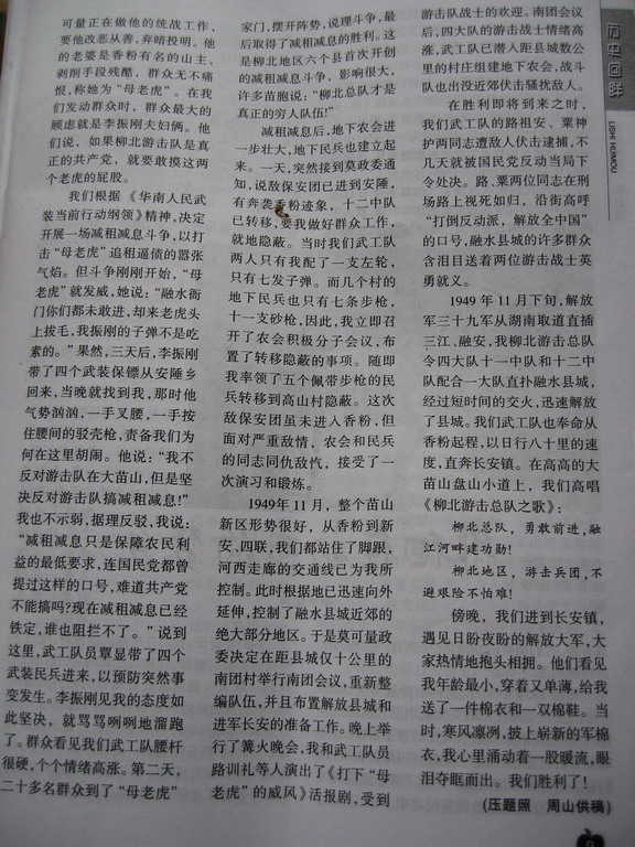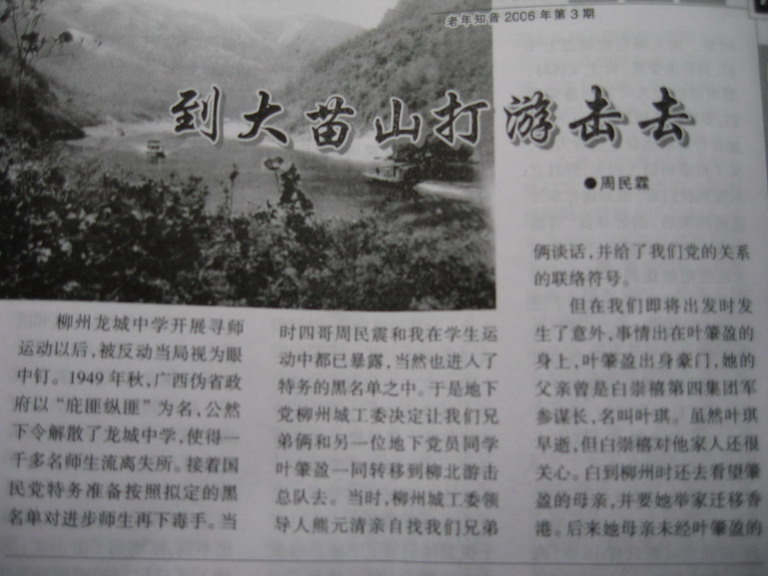 今日翻开我老豆订的一本《老年知音》2006/3期看到我们区泳协周主席一篇文章《到大苗山去打游击》细细读了一遍,感觉周主席好伟大。