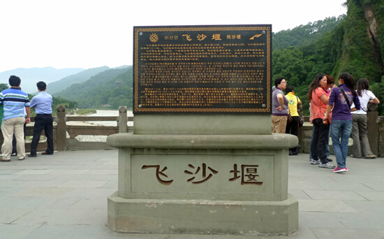 飞沙堰:飞沙堰溢洪道在鱼嘴分水堤尾部与人字堤间。堰口宽240米,顺溢流方向长120米。飞沙堰坝顶平均海拔728.25米。飞沙堰唐代名“侍郎堰”,又称“中减水”。