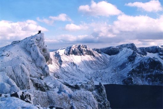 长白山是一座活火山,火山喷发后自然形成了一个美丽迷人的火山口湖——天池。由天文峰俯瞰,冬季的天池犹如一块白玉镶嵌在群峰之间。冰封的长白山天池,周围环绕着十六座海拔2500米以上的山峰。天池每年11月末封冻,冰层厚达1至2米。但神奇的是,并非全部湖面都结冰,在华盖峰下面的湖中,有一处200米长、20多米宽的狭长水面终年不结冰,这便是池中温泉群的所在地。湖底常有气泡冒出,冬季水温在10摄氏度左右,故天池又名温凉泊。