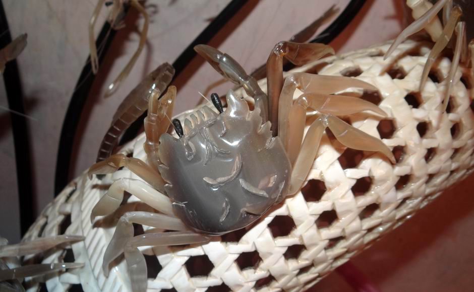 老白的《中国梦》作品选材:角雕的水浪选用形态奇特,纯天然的盘羊角制作,主题虾、蟹、鱼选用广西白水牛角,角肉较通透,雕刻后看到虾蟹的内脏,让人感到逼真,栩栩如生。蟹笼选用非洲黄牛角制作,水草等用西北黄牛角制作,画内头字用墨中带蓝的水牛角制作,后落款用白水牛角制作,保证百分百用牛羊角材料,不添加任何颜色。