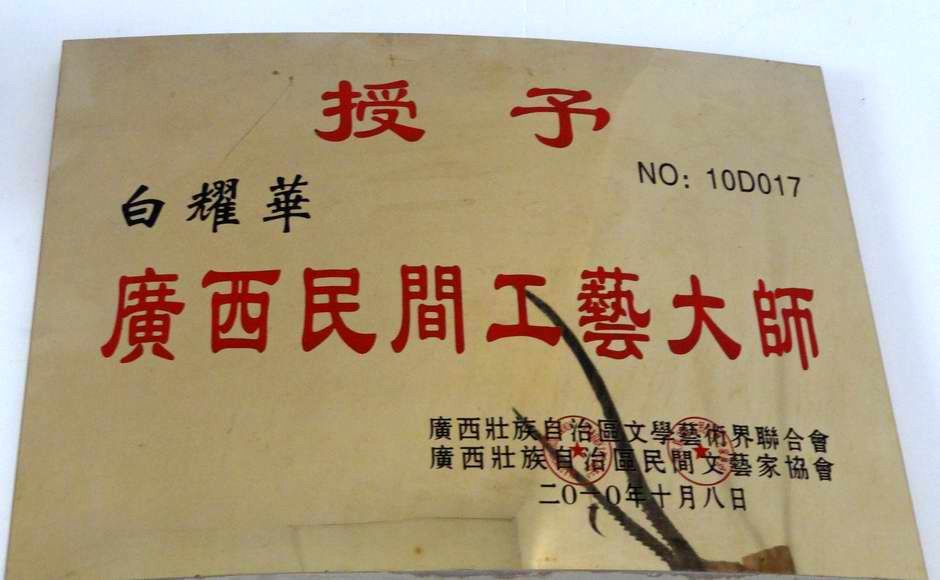 老白参加“2014年北海优秀旅游商品评选活动”中有两件牛角雕“百年好合”和“潮涌北部湾”艺术作品参加评选,在74套共计133件参赛作品中脱颖而出,其中“百年好合”荣获旅游用品类金奖,“潮涌北部湾”荣获旅游工艺品类银奖。