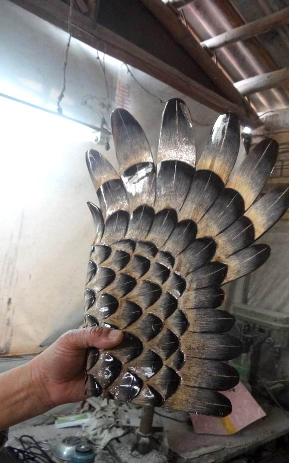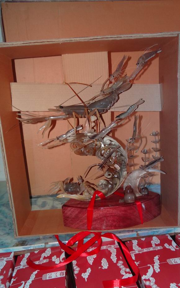 在“白耀华工作室”我们受到白耀华泳友的热情接待,老白带我们参观了《中国梦》并对《中国梦》的创作构思和制作过程作了介绍。老白还带我们参观他的作品陈列室和角雕工艺品制作车间及成品库等,老白祥细地向我们介绍合浦角雕文化和动物角质的特性,对角质材料与其它材料在雕刻制作上的差别进行剖析。