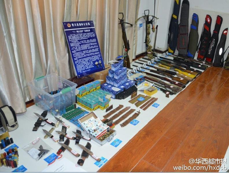 广元青川查获的偷猎团伙的作案工具及非法猎获的野生动物制品。图为收缴的**13支,猕猴头、斑羚角等野生动物制品23件。