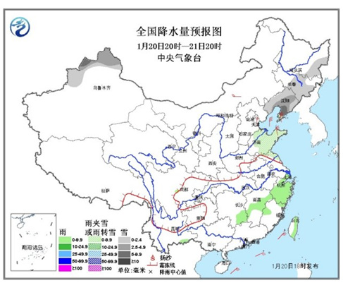20日20时至21日20时,新疆北部、黑龙江东部、吉林中东部、辽宁大部、山东大部、江苏东北部等地有小到中雪或雨夹雪,局地有大雪;湖南东南部、江西中部、浙江大部等地有小雨。内蒙古中部、华北东部等地有4~5级风,辽东半岛、山东半岛等地有5~6级偏北风。渤海有7~8级、阵风9~10级偏北风。 中新网1月20日电 中央气象台发布最新天气预报,预计,20日夜间至21日,受弱冷空气影响,长江中下游以北地区先后有4~6级风,部分地区气温将下降4~6℃,东北地区中南部降温8~10℃。东北地区大部、山东大部等地有小到中雪或雨夹雪,局地大雪。