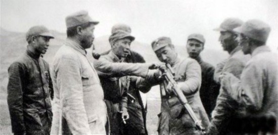 1945年,联防司令部司令员贺龙和参谋长张经武向参加党的七大山东代表团团长林彪和副团长朱瑞介绍狙击步枪。
