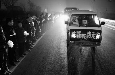 1月15日,手拿白花的村民在公路边为陈群送行。