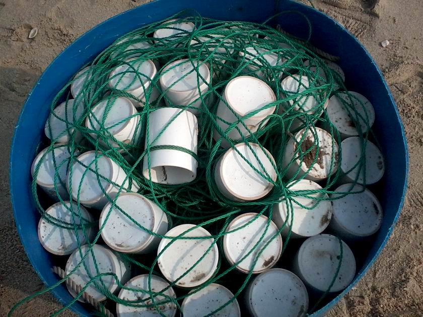 见老陈没有网到鱼,我便往回走,到东边沙滩时见有渔民从艇上卸下10多筐八爪杯网具,我问艇上的渔民:不出海了?