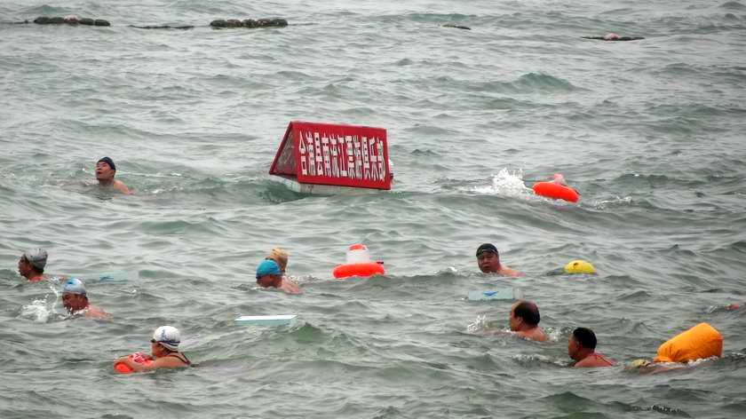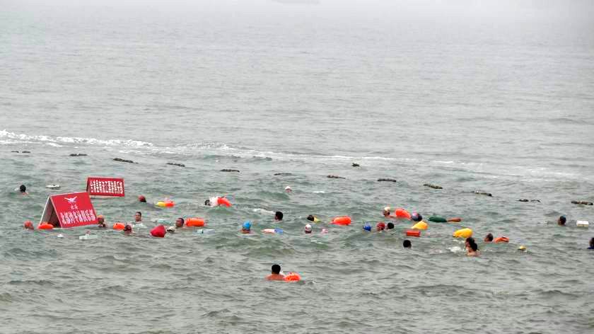 10点28分,下水畅游队伍举着队旗,抬着队牌走下海滩,队员们缓缓步入海中向大海游去。
