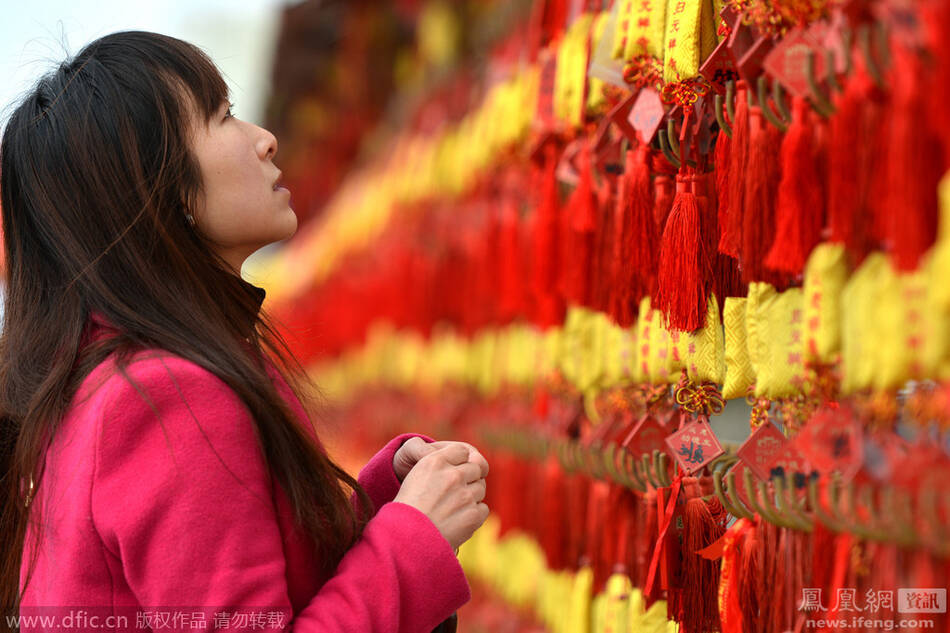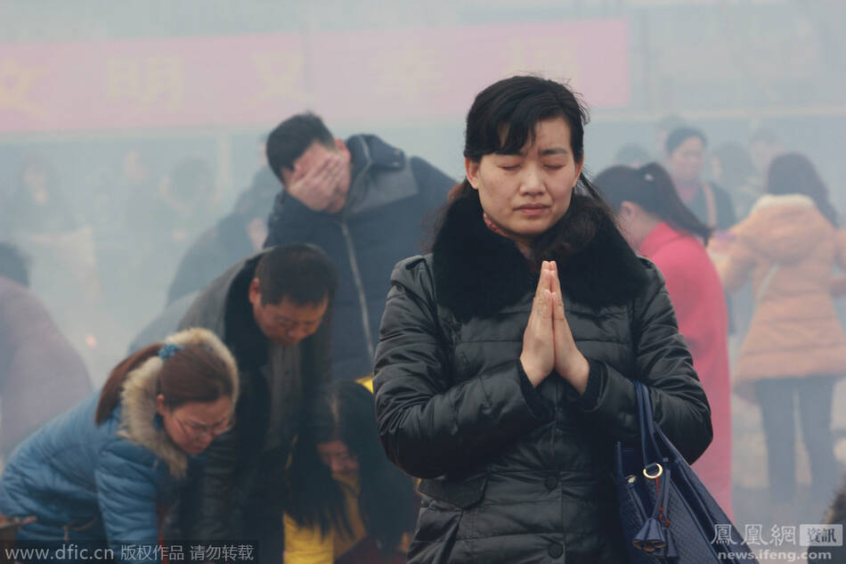 2015年2月23日,湖北武汉归元寺,数十万市民前来给财神爷上香祭拜,场面夸张胜过春运。中国民间有正月初五拜财神和财神爷巡游民间送福送财的习俗。图为前来拜财神上香祭拜的民众。