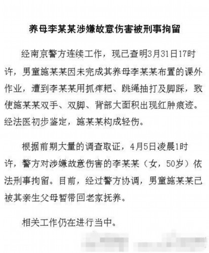 经南京警方连续工作,现己查明3月31日17时许,男童施某某因未完成其养母李某某布置的课外作业,遭到李某某用抓痒耙、跳绳抽打及脚踩,致使施某某双手、双脚、背部大面积出现红肿痕迹。经法医初步鉴定,施某某构成轻伤。