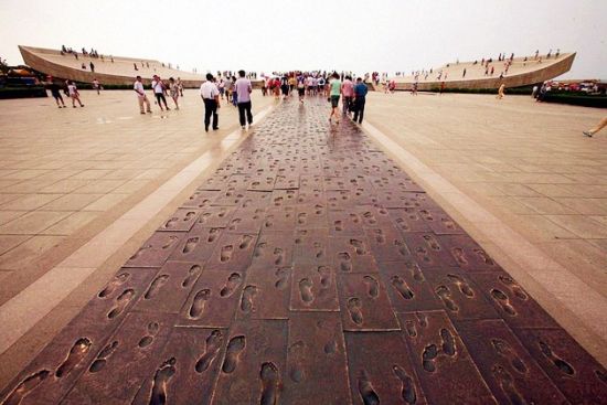百年城雕是最有特色的雕塑,像是一本翻开的书,与与1000位对大连城市建设有突出贡献者的脚印相连,好多游客都会将自己的脚印和这些名人的脚印进行对比。