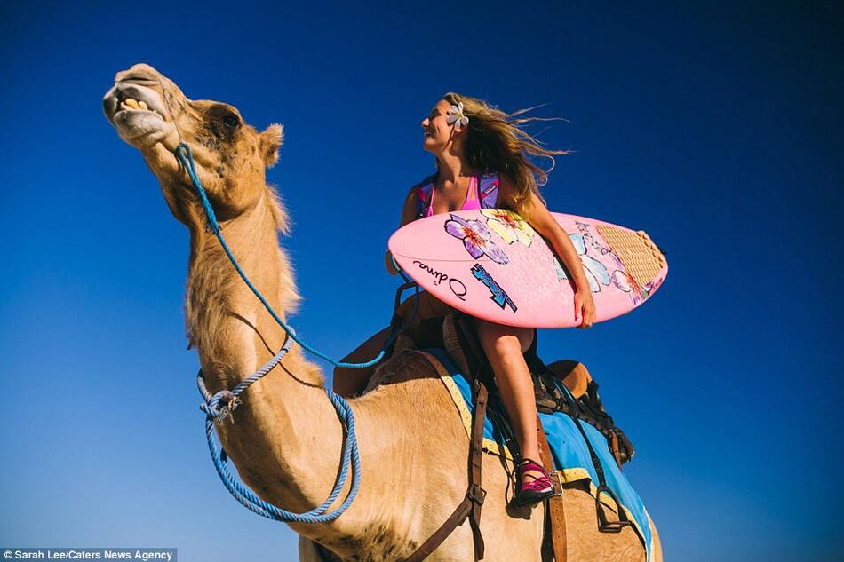 艾莉森在印度西部拉贾斯坦沙漠骑骆驼。