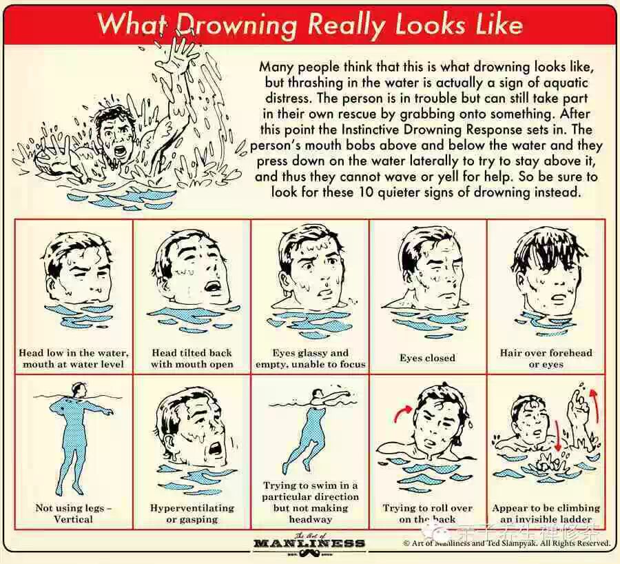 | 实际上一年来我看到即将溺水的孩子,就是上一排中间的图:眼睛睁着,嘴巴半闭,身体垂直,有时候嘴巴在水上,有时候嘴巴在水下。上下漂浮。但最最主要的是,身体都是垂直的。如果要真的躺水面上,大家早就知道大事不妙了。 |