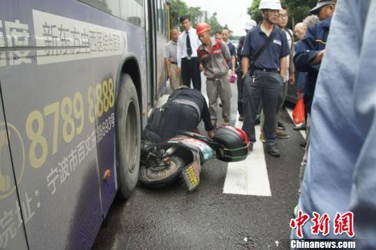当时,江东交警大队协警谢师傅正在附近路口执勤,接到指令后马上跑到事发现场,并将现场情况报告交警指挥中心。