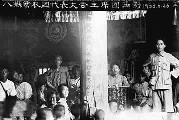 1933年6月26日,中央苏区八县贫农团代表大会主席团合影。右一为毛泽东。