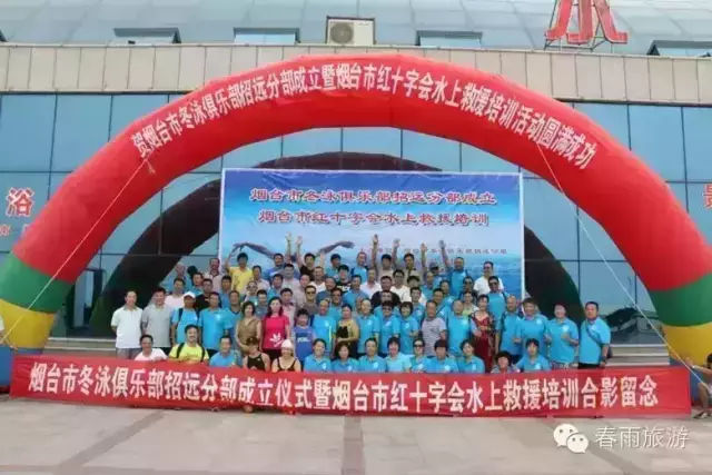 23日,春雨滨海度假村水上乐园北门锣鼓喧天,100多名各地游泳爱好者齐聚一堂,共同见证烟台市冬泳俱乐部招远分部成立。烟台市红十字会培训中心主任袁连营,烟台市冬泳俱乐部理事长王立权,招远市红十字会会长王振玉以及烟台市冬泳俱乐部招远分部会长杨伟出席此次活动。