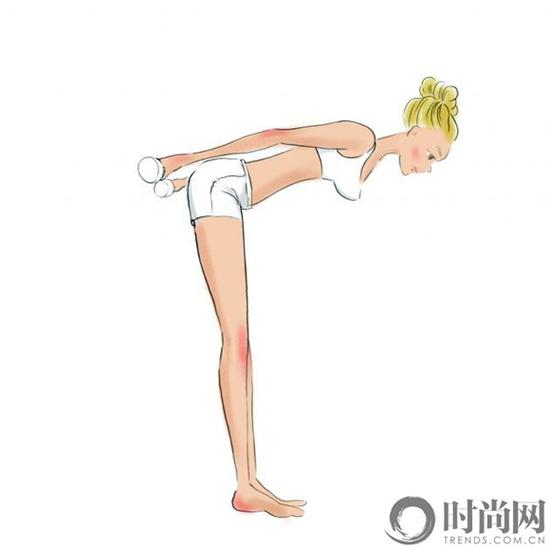 STEP2: 吸气,手臂伸直尽量往后拉伸,做飞翔状。手腕向外翻转,让哑铃与手臂呈一字直线,呼气,双手慢慢往回放置身前,回复原位。
