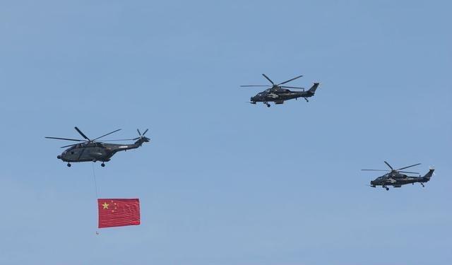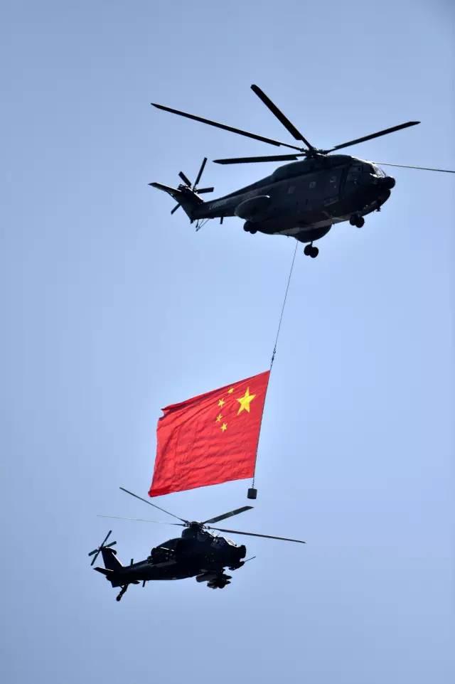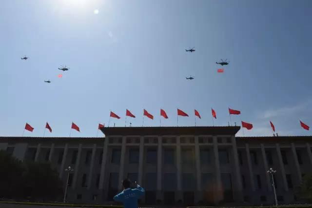 中国利用神舟飞船返回着陆的降落伞技术制造了巨幅国旗和军旗。 9月3日纪念抗战胜利70周年的大阅兵中,直升机悬挂着这两面旗帜,以每小时180公里的速度飞过天安门,接受党和国家领导人的检阅。
