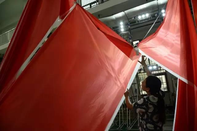 红旗布料是由专门厂家特制的。每次到货后,研制人员就把布料悬挂起来,用50多个强光灯组成的灯阵照射布料,对布料的密实度、染色均匀度、颜色在光照下的效果等进行细细检验,确保用于红旗加工的每一寸布料都符合要求。