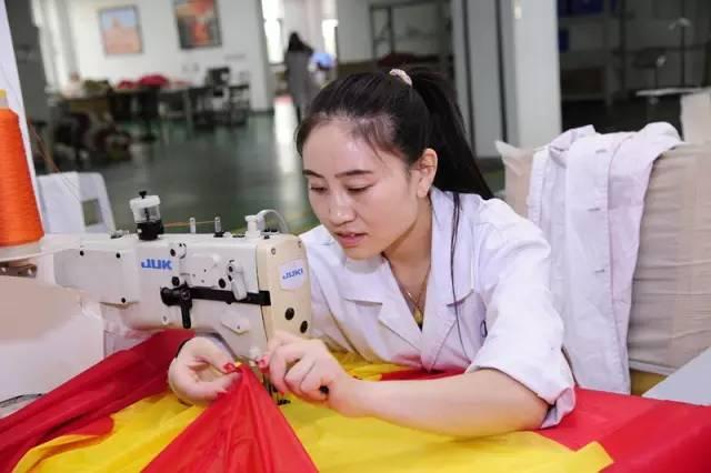 巨型红旗的技术含量不光体现在设计上,制作上也有“针功夫”。红旗很大,没有那么宽的整片布一气呵成,因此用了航天降落伞缝纫技术,将七片布料拼接而成。这种技术本质上和平时缝纫衣服是一样的,但应用于航天降落伞的缝纫,对缝纫机选择、缝合形式、缝纫宽度、缝线针脚长度、缝线松紧程度、缝线的材料等都有严格要求,必须满足航天标准要求才能使用。如果按照航天标准制作服装,成本会高些,但做出来的质量绝对一流,穿几十年也不会开线。