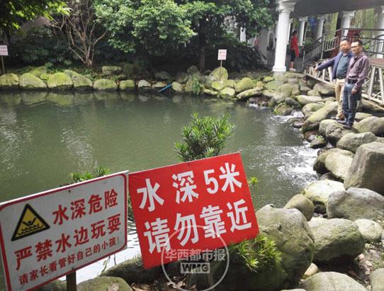 水池边警示牌写着:严禁水边玩耍,请家长看管好自己的小孩