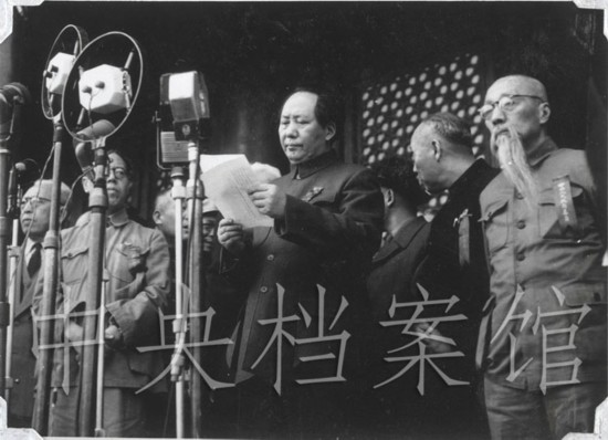 1949年10月1日,毛泽东在开国大典上宣读中央人民政府公告