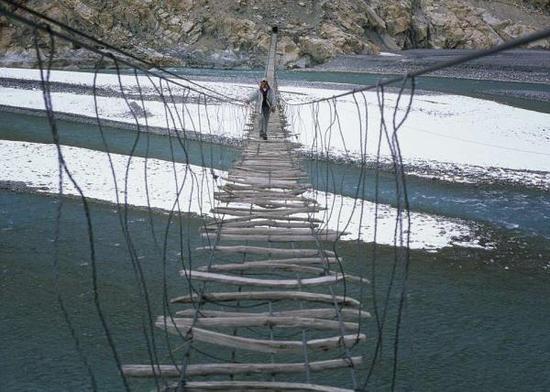 在巴基斯坦的喀喇昆仑山脉,能穿越罕萨河的唯一通道就是这座看起来弱不禁风的胡塞尼吊桥。这座桥是由各种不同形状的木头捆绑起来横在河流上方,堪称是世界上最危险的桥。