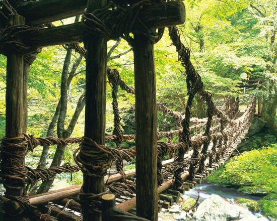 在日本的四国岛有三座葡萄树桥,这座最小的葡萄树桥上面的木板每条都间隔了18-30厘米,走在上面感觉非常刺激。