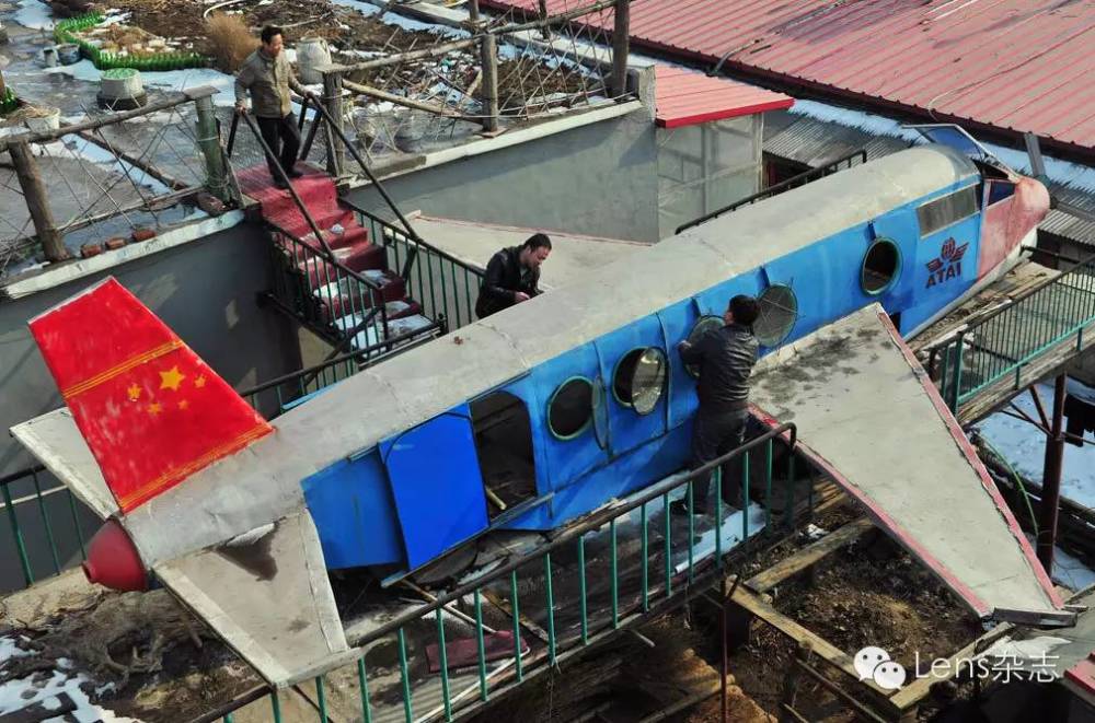 2012年2月28日,58岁的农民李景春与家人在自家房顶上修整他的自制飞机。这辆飞机是由回收金属片制成的,花了李景春将近4万块钱和两年时间。
