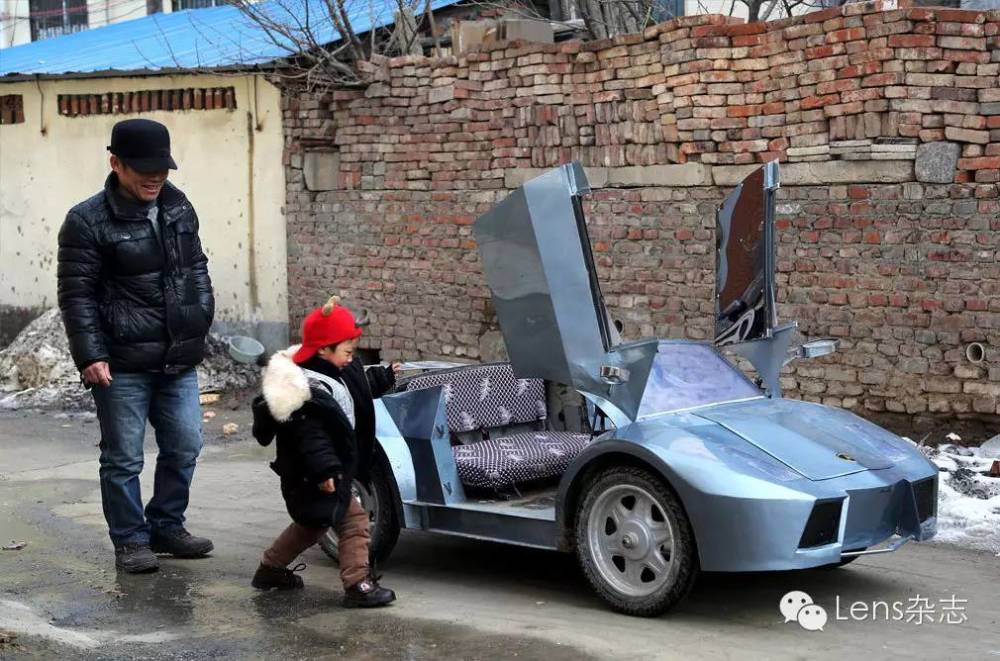 2014年2月,河南郑州农民郭先生展示这部自制的颇具异国风范的跑车。他花了5000元采购模型,前后耗时6个月,完成了这部“兰博基尼”。充满电后,它可以跑60公里左右。