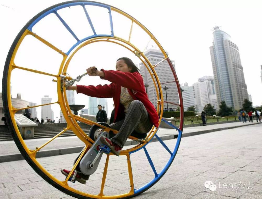 2004年2月28日,一名女子在上海一个公园里踩独轮车。这辆独轮车是李永利在几年前发明的,李永利把它称为“世界第一的交通工具”。